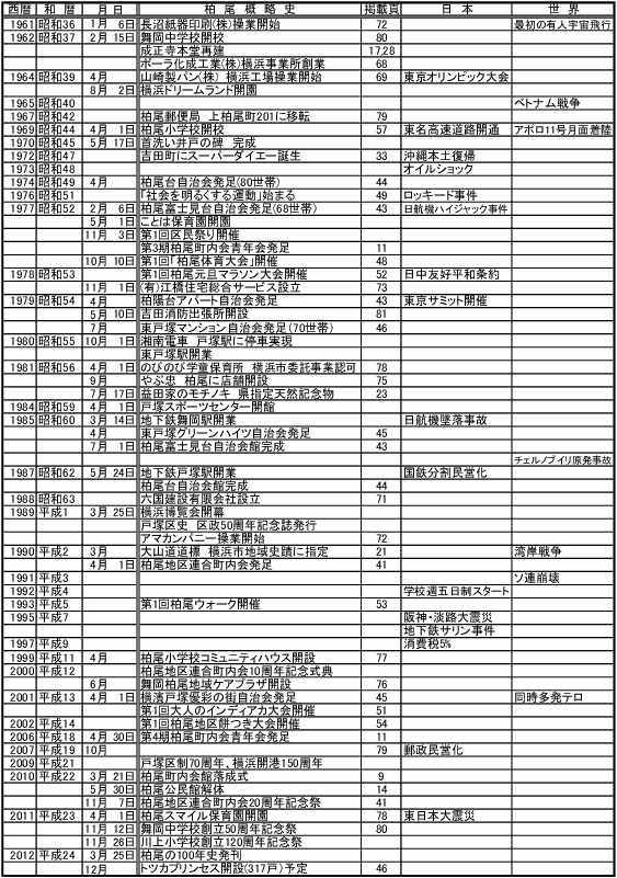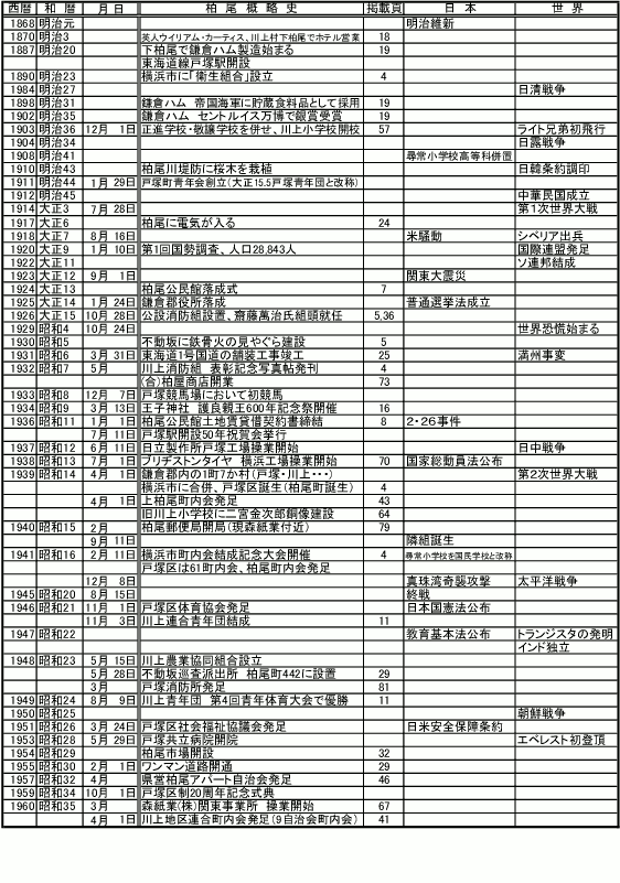 柏尾ヒストリア 2015.09.01 柏尾百年史 第一期版 明治、大正、昭和、平成と柏尾100年の歩みを今に伝えます。 1.表紙・目次 2.柏尾と柏尾町内会編 3.柏尾地区連合町内会編 4.地域学校編 5.地域事業所・施設・商店編 柏尾の100年 概略史